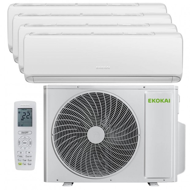 Multisplit EKOKAI (2×1, 3×1, 4×1, 5×1). Climatiza hasta 5 estancias de forma independiente con una sola unidad exterior. Combina unidades split, cassette o conductos. Con clasificación energética A++, tecnología inverter, refrigerante R-32 y funciones inteligentes como WiFi, control por voz, I FEEL, autolimpieza, temporizador, modo turbo, filtros esterilizadores y autodetección de errores. Diseño elegante con frontal retroiluminado, fácil instalación y hasta 7 velocidades de ventilador. Ideal para hogares, oficinas y comercios.