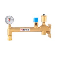 El kit soporte ACS en latón esta diseñado para la instalación de vasos de expansión con capacidades desde 5 hasta 40 litros. Incluye accesorios de seguridad y control que garantizan un funcionamiento fiable del sistema. Presenta una distancia entre tomas de 225 mm y esta compuesto por un soporte en latón resistente, un purgador de boya automático con válvula de retención y una válvula de seguridad con conexión de 1/2 a 3/4. Incorpora un manómetro de 63 mm con escala de 0 a 10 bar, aguja roja y zona verde. El conjunto se completa con un racor de tres piezas de aislamiento con doble válvula de retención, que permite la conexión y desconexión del vaso de forma sencilla y segura.