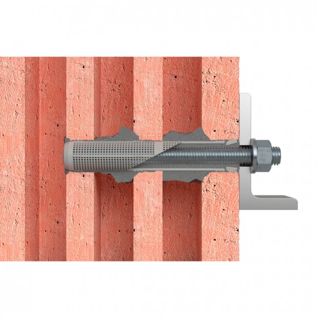 Principales ventajas: Rejilla del tamiz ideal para tacos químicos, resinas y morteros de cemento de inyección que garantiza su bajo consumo y fijación; las aletas permiten el empleo de diferentes varillas roscadas y las púas montaje suspendido.\rPrincipales aplicaciones: Anclajes en mampostería de piedra perforada con resinas de inyección en materiales de construcción como ladrillo perforado, bloques de hormigón huecos, ladrillos macizos y también para losetas de piedra pómez.\rTecnología: Versátil sistema de fijación para mampostería de piedra perforada, adecuado para toldos, marquesinas, protección solar, puertas, pasamanos, consolas, tuberías, sanitarios.