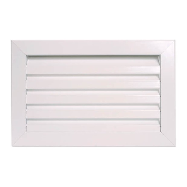 Rejilla de difusión de aluminio extrusionado con marco estándar de 26 mm y lamas horizontales fijas para la toma de aire exterior. Provista de malla antipájaros y lama antivisión con paso 25 para evitar el paso de elementos externos.