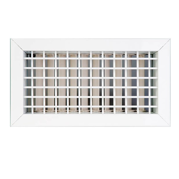 Rejilla de difusión de aluminio extrusionado con marco estándar de 26 mm y lamas horizontales y verticales móviles, que permiten su regulación de forma individual, adaptando el alcance y la vena de aire a las necesidades requeridas.\r\rDispone de compuerta de regulación de caudal integrada, accionable manualmente, por medio de tornillo.