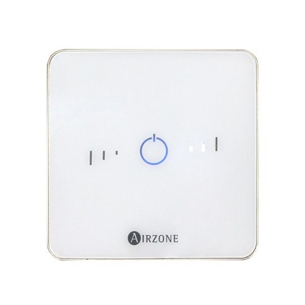 Termostato con botones capacitivos y elegante acabado en acero y cristal, diseñado para el control de temperatura por zona en sistemas Airzone. Se comunica por cable y se alimenta desde la central del sistema. Permite encender o apagar la zona, ajustar la temperatura en pasos de 1 °C (hasta ±3 °C), y muestra la temperatura ambiente y la humedad relativa. Disponible en blanco y negro.
